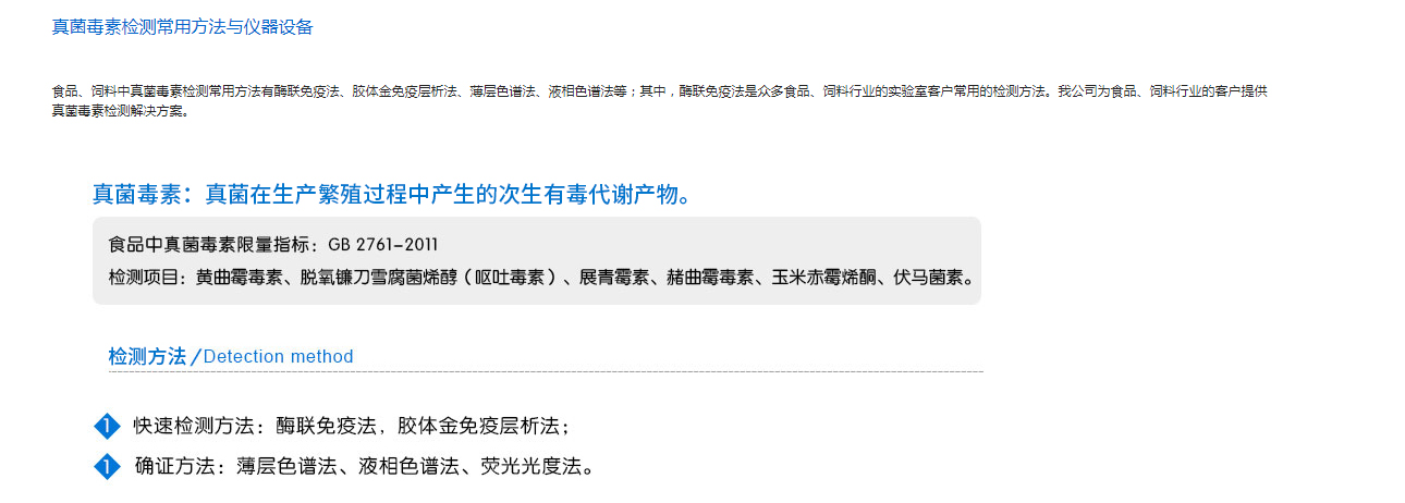 真菌毒素檢測常用方法與儀器設備 食品、飼料中真菌毒素檢測常用方法有酶聯免疫法、膠體金免疫層析法、薄層色譜法、液相色譜法等;其中,酶聯免疫法是眾多食品、飼料行業的實驗室客戶常用的檢測方法。我公司為食品、飼料行業的客戶提供真菌毒素檢測解決方案。