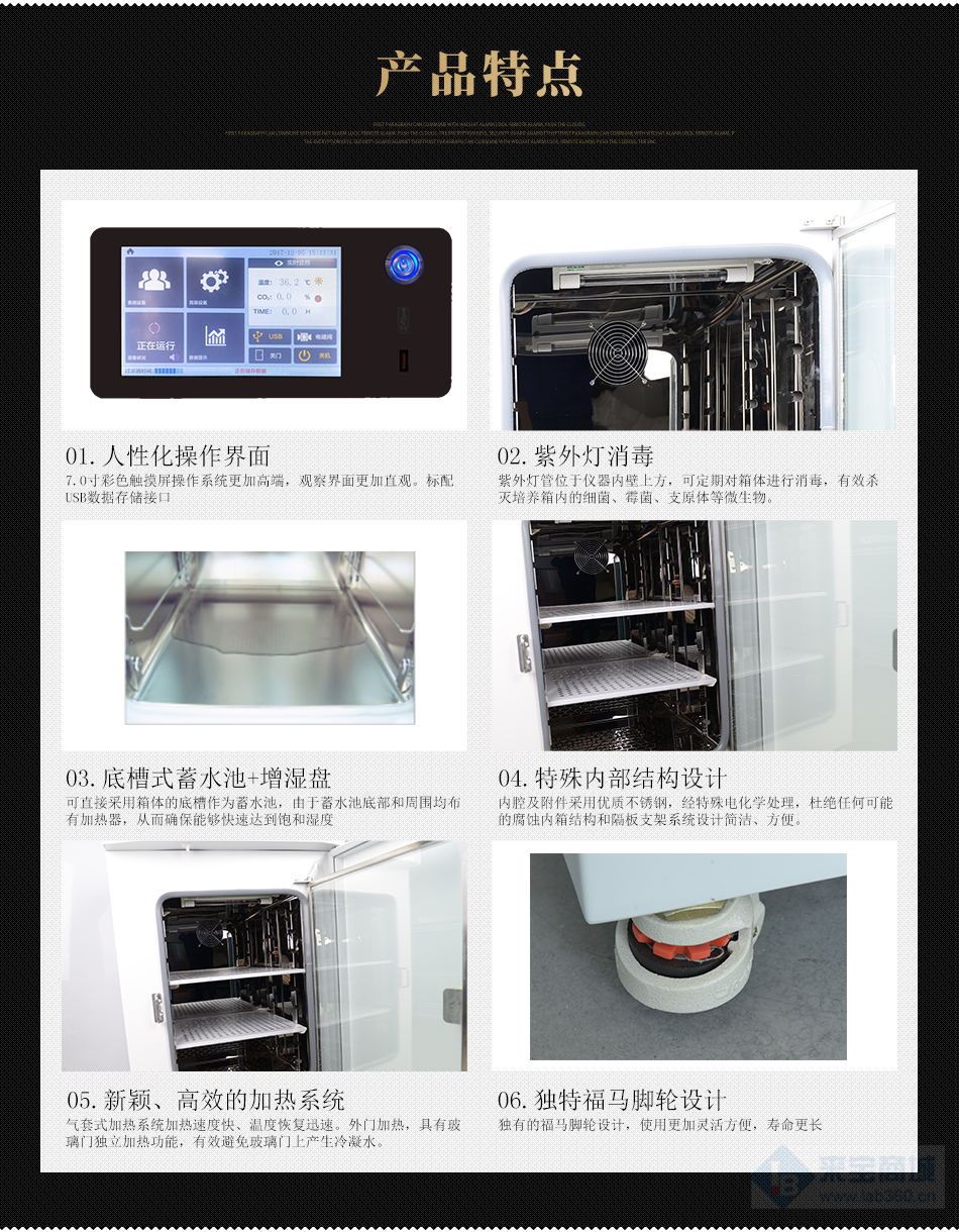 ● 水套式二氧化碳培養(yǎng)箱標配HEPA過濾器,針對直徑大于等于0.30.3μm的顆粒,過濾效率達99.95%,可選配紫外燈。