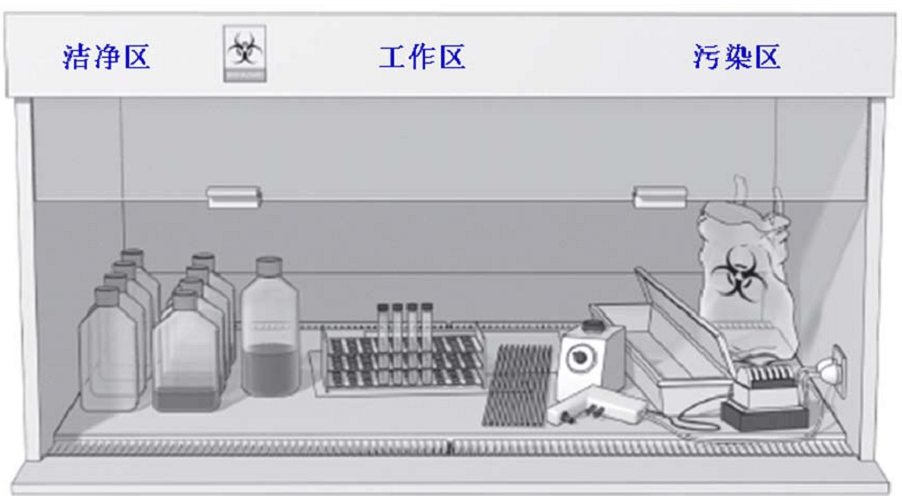 生物安全柜的工作區應該從左往右或者從右到左被依次劃分為三個區域:清潔區、操作區和污染區。而實驗供給品應放置在潔凈區內;實驗儀器和樣品應放置在操作區域;廢棄物應放置在污染區內。