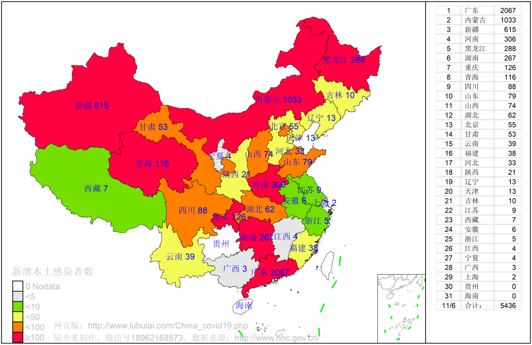 11月6日0—24時(shí),31個(gè)省(自治區(qū)、直轄市)和新疆生產(chǎn)建設(shè)兵團(tuán)報(bào)告新增確診病例569例。其中境外輸入病例34例(廣東10例,福建6例,北京3例,四川3例,內(nèi)蒙古2例,上海2例,江蘇2例,天津1例,遼寧1例,浙江1例,山東1例,云南1例,陜西1例),含4例由無癥狀感染者轉(zhuǎn)為確診病例(北京1例,天津1例,江蘇1例,四川1例);本土病例535例(其中廣東224例,內(nèi)蒙古57例,河南42例,重慶42例,北京41例,新疆30例),含60例由無癥狀感染者轉(zhuǎn)為確診病例(廣東39例,四川5例,北京4例,陜西3例,黑龍江2例,福建2例,青海2例,山西1例,云南1例,寧夏1例)。