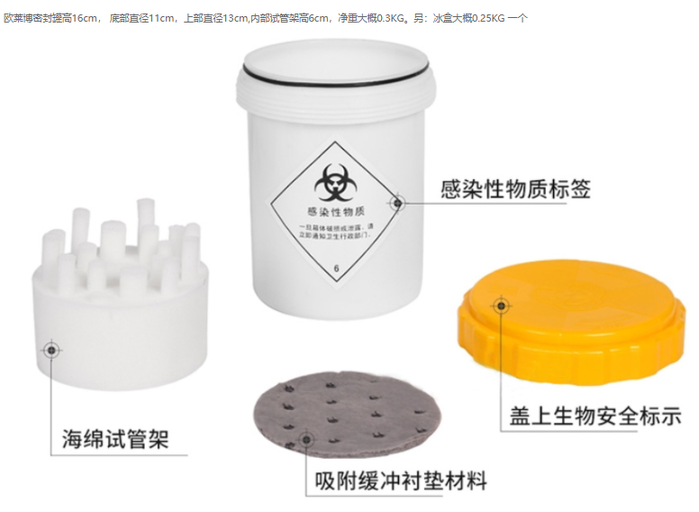 歐萊博密封罐高16cm, 底部直徑11cm,上部直徑13cm,內部試管架高6cm,凈重大概0.3KG。另:冰盒大概0.25KG 一個